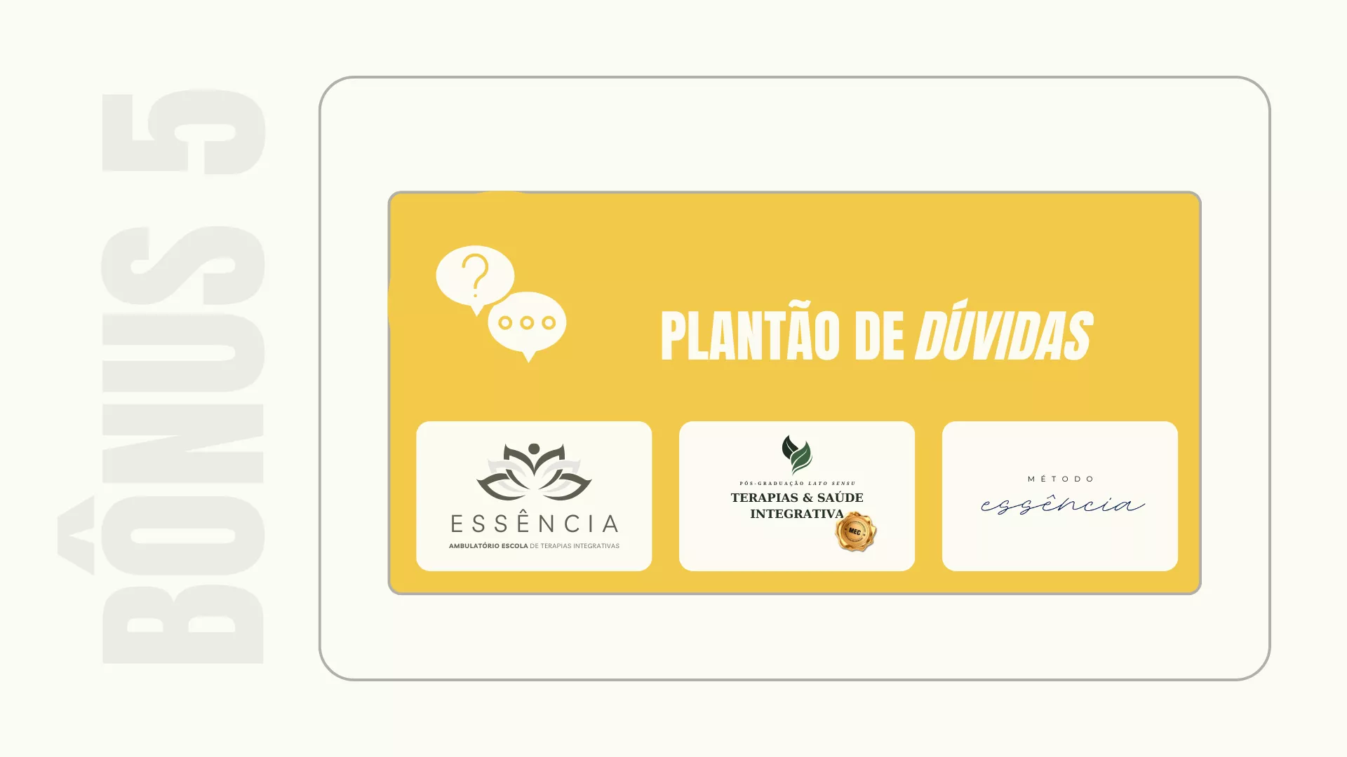 Ao entrar na Pós-Graduação em Terapias e Saúde Integrativa, você também terá acesso ao Ambulatório Escola de Terapias Integrativas, Método Essência, Sistema de Navegação Ativo, Tutor 24 horas e Plantão de Dúvidas.