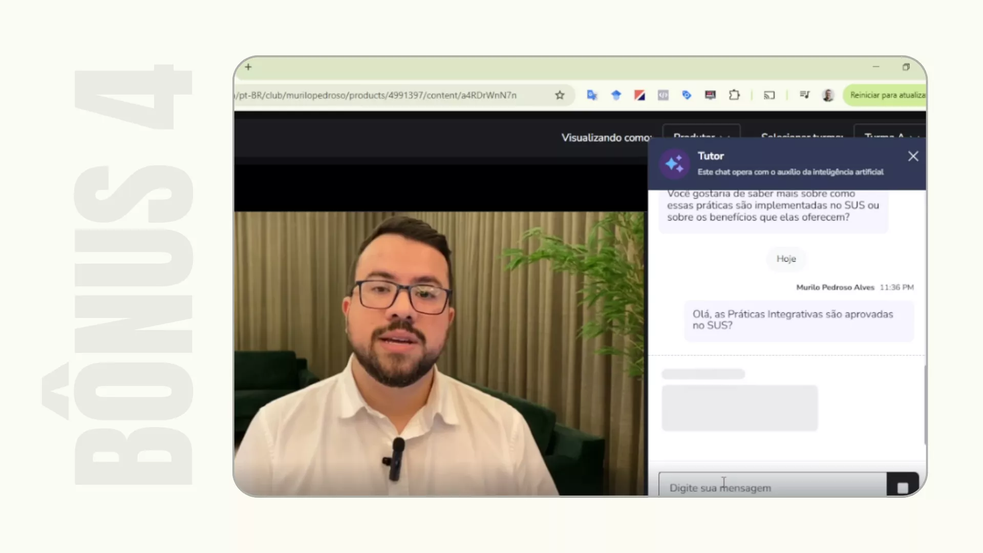 Tutor de plantão 24 horas. É um tutor de Inteligência Artificial que você vai poder tirar suas dúvidas em tempo real, sem precisar enviar e-mail, mensagem no WhatsApp ou sair da plataforma durante as aulas. Teve dúvida? Basta perguntar para o seu tutor que ele vai te responder.